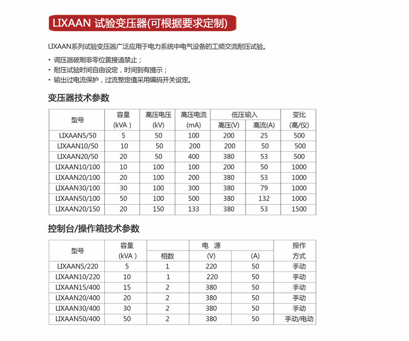 LIXAAN 试验变压器(可根据要求定制)